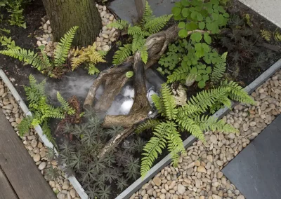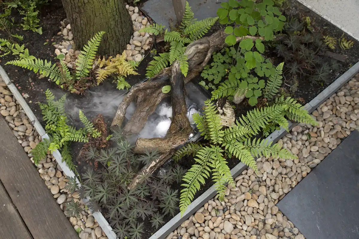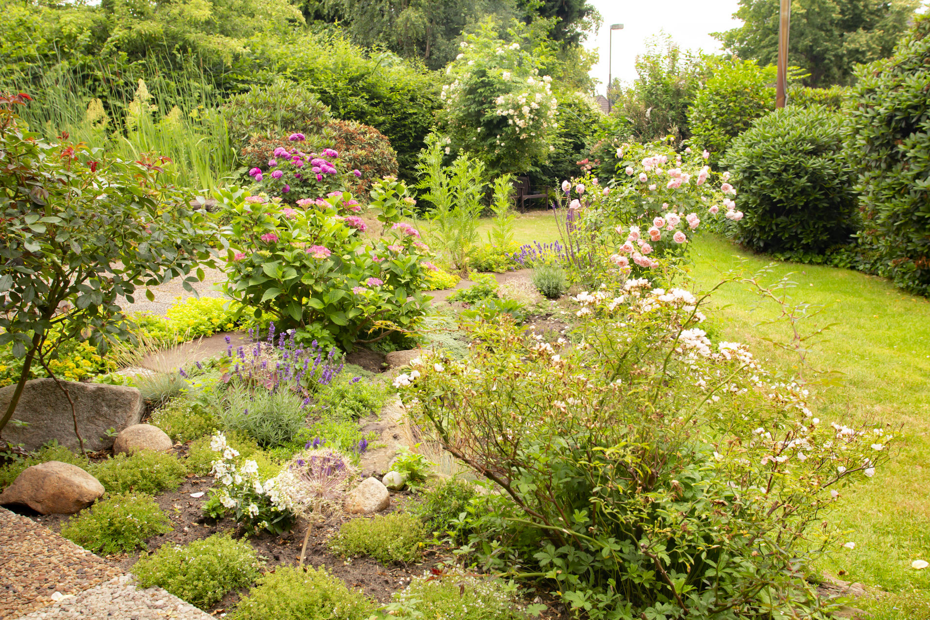 Großer Steingarten mit Bäumen und Bepflanzungen